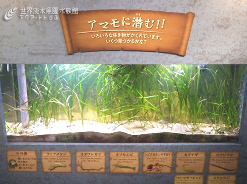 自然のアマモ場には様々な生き物が生息しているので、今回の企画展の中でも、一番生き物が多く隠れている水槽です。