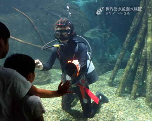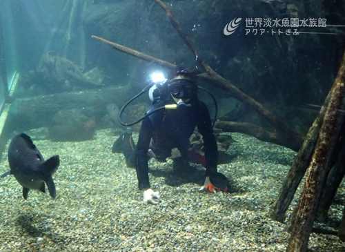 毎朝、水槽内の掃除のために、大型の水槽に当番制で入ります。