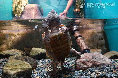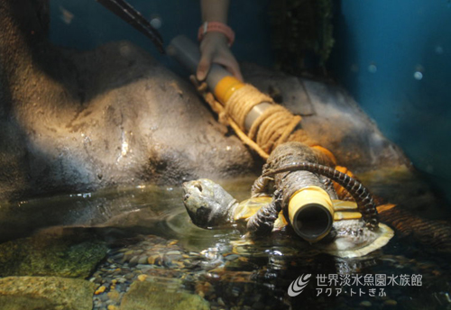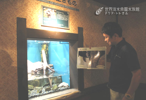 場所は、水族館2F「雲南省の生き物」にある、オオアタマガメ水槽です。