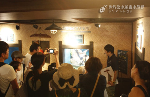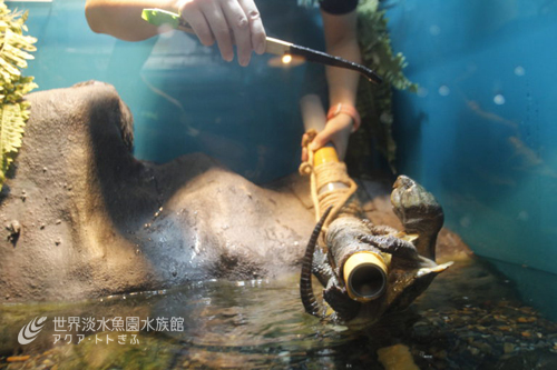 展示水槽前で一人のスタッフがカメの生態などについてガイドをしながら、私がバックヤードでトレーニングをし、その様子を観察してもらうというもので、小さな水槽ではありますが、大勢の方に見ていただけて、わたしも満足です。
