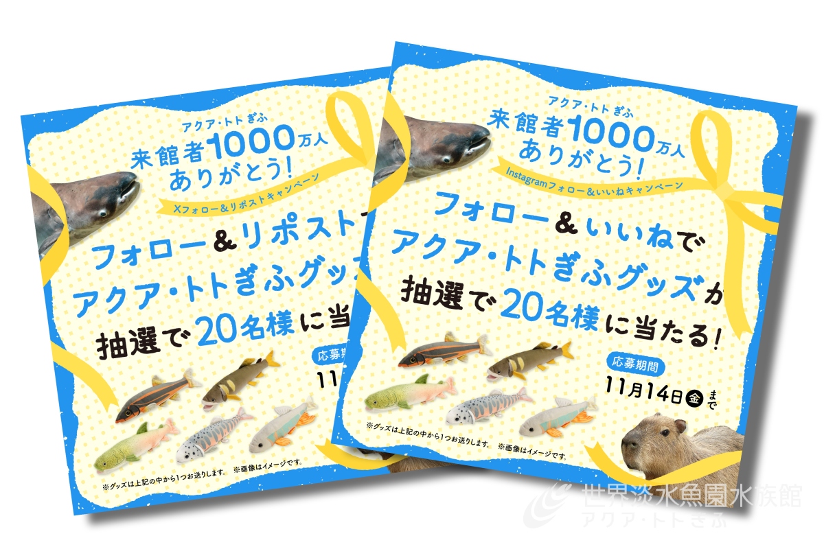 「来館者1000万人ありがとう!」の投稿を、Xでフォロー&リポストもしくは、Instagramでフォロー&いいね!していただくと、抽選でそれぞれ20名様にアクア・トト ぎふグッズが当たる!