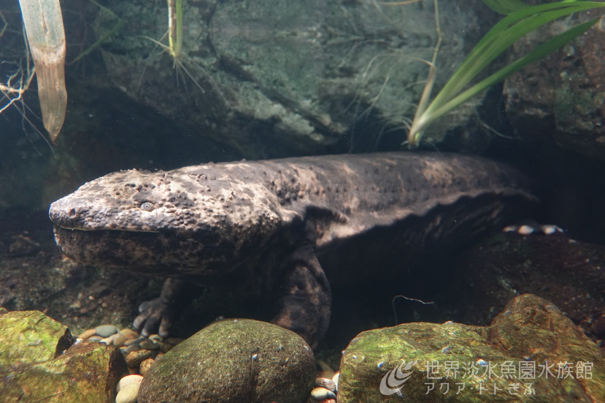 普段はアクリルガラス越しに見るオオサンショウウオが水槽の前に登場!どれくらいの長さがあるのでしょうか。
