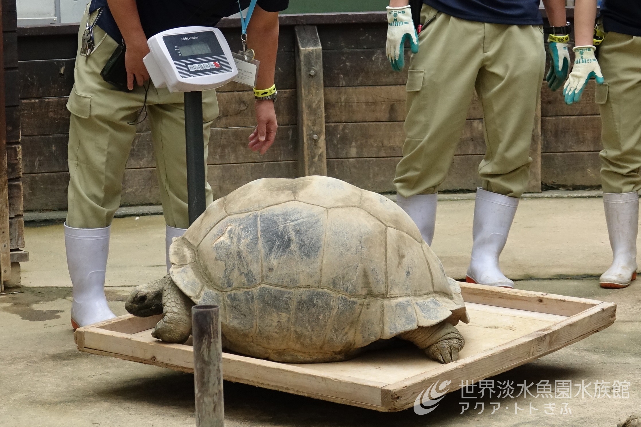 世界最大級のリクガメであるアルダブラゾウガメの体重測定を実施します。