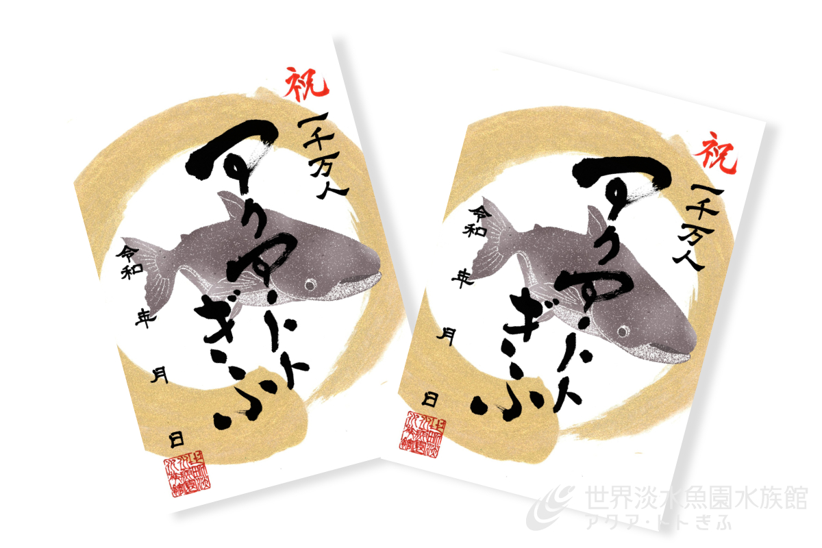 来館者1000万人を記念して、限定デザインの魚朱印が登場!各務原市出身の書道アーティスト、田中美琉氏とコラボしました。
