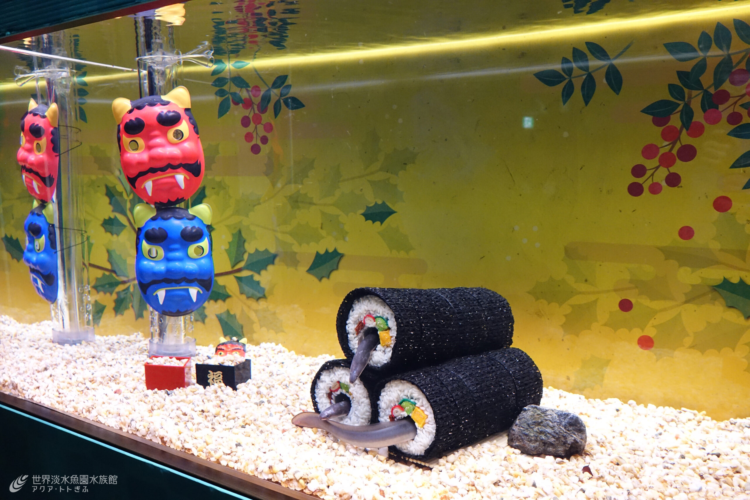 水槽内には、大きな恵方巻を模した飾りを設置しまし