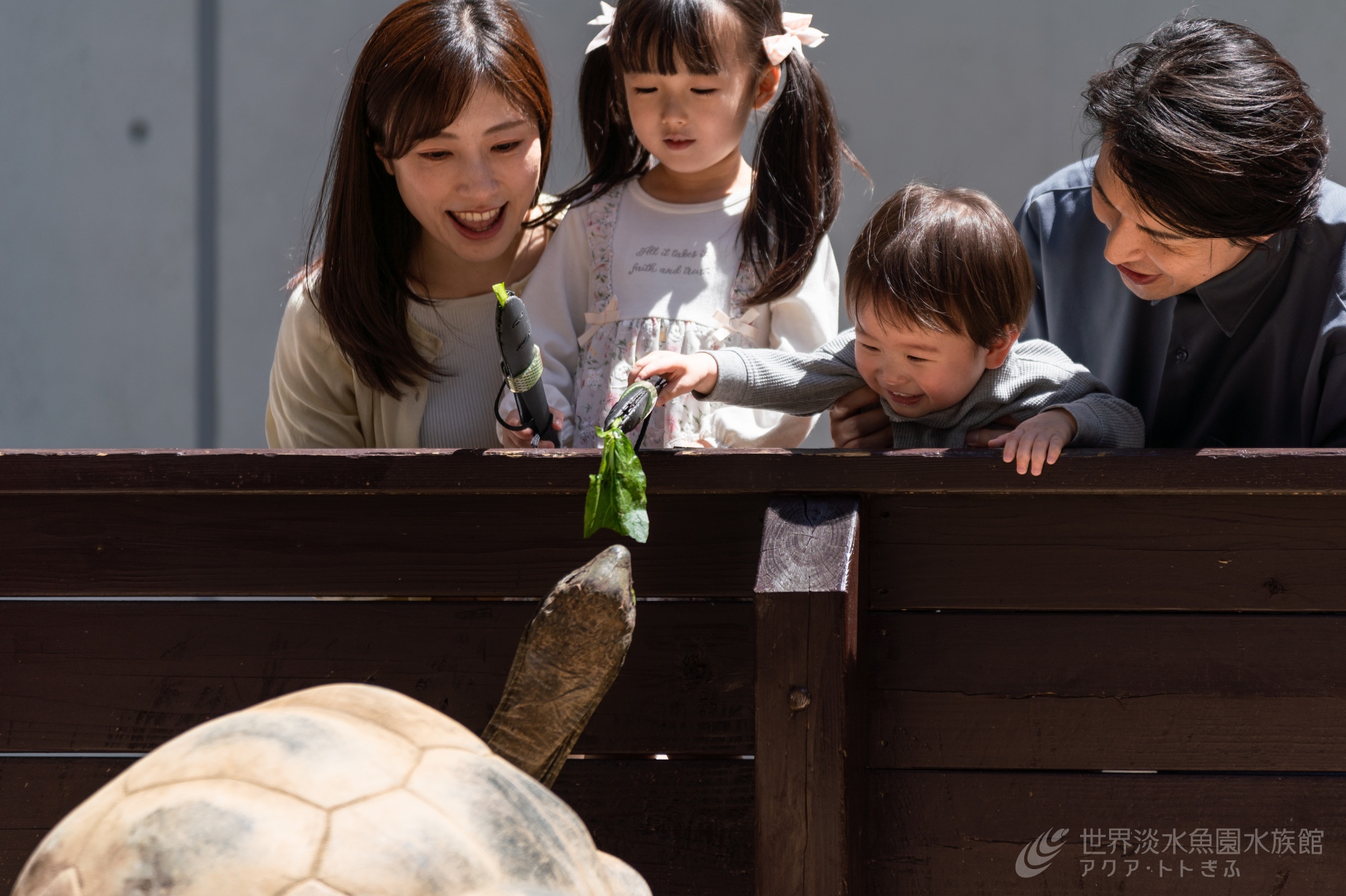 アルダブラゾウガメにごはんをあげながら、食べる様子を近くで観察できます。