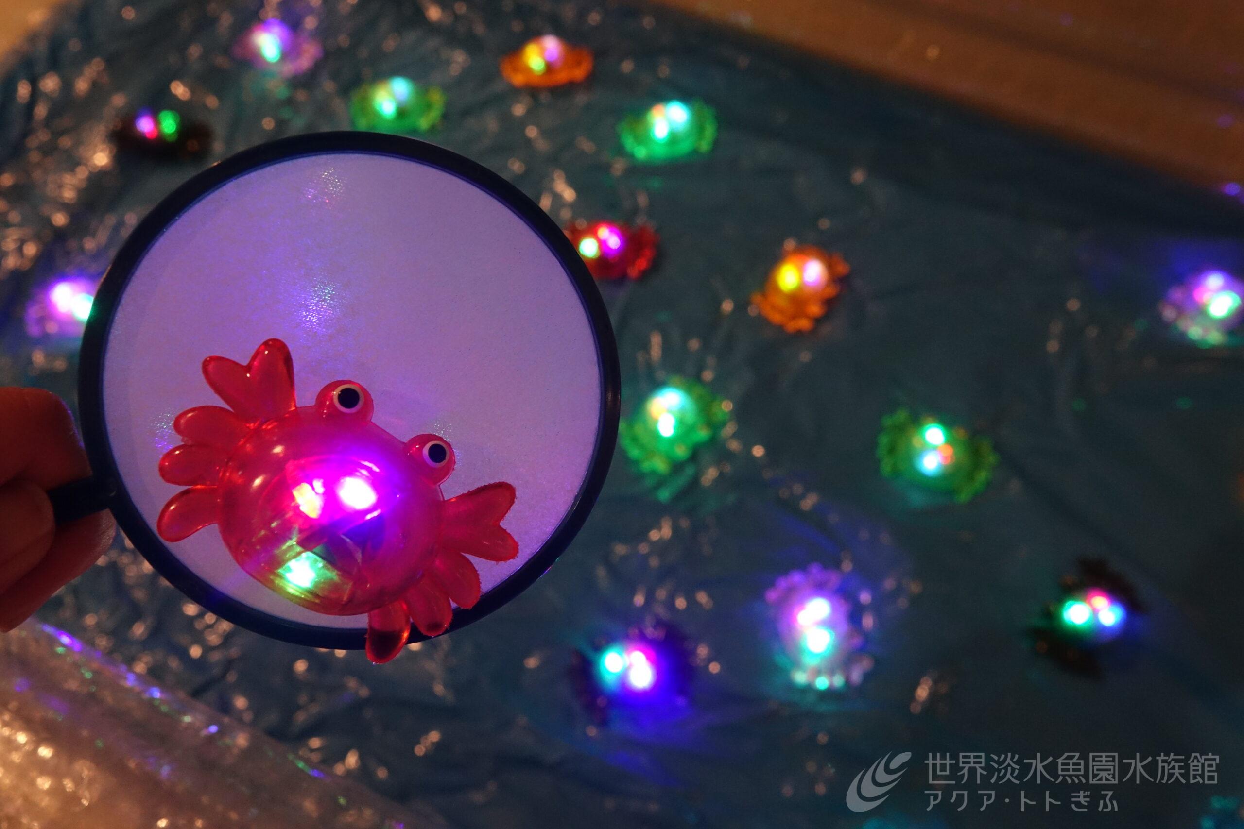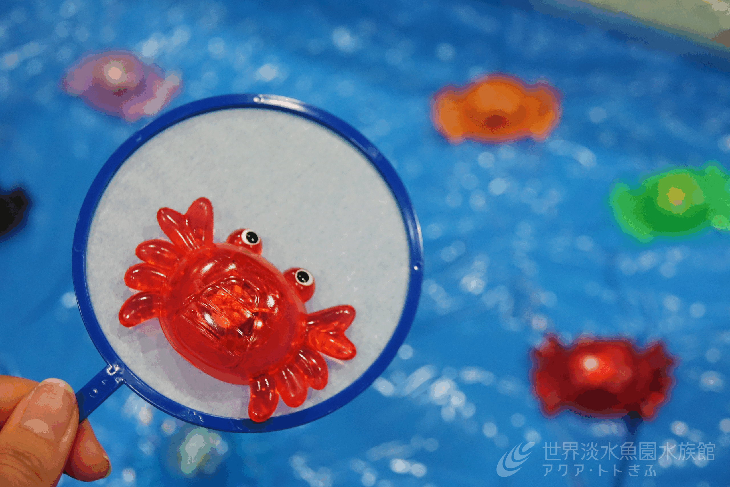 プールの中に浮いているおもちゃのカニをすくってみよう!