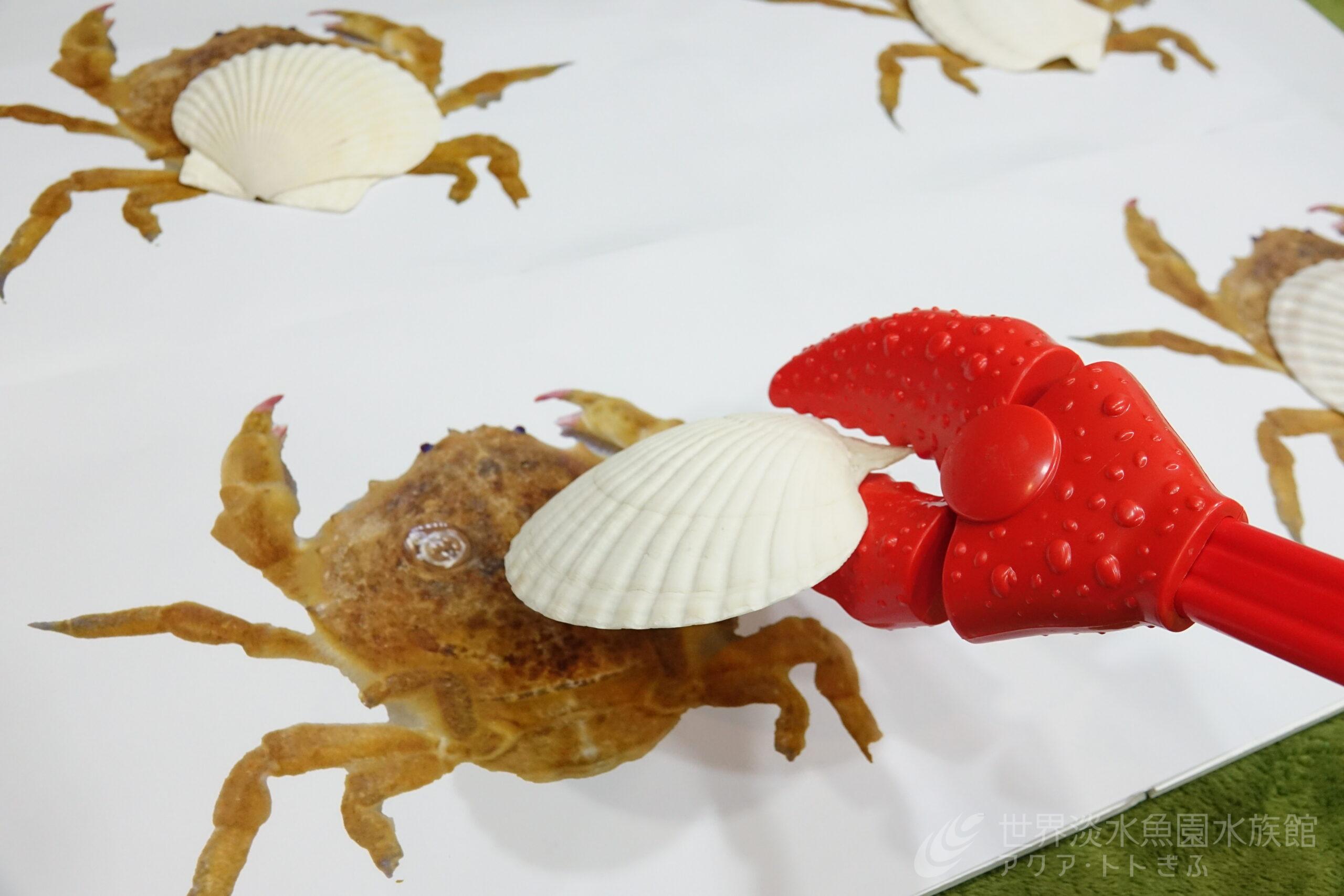 カニのはさみのマジックハンドを使ってカイカムリに貝殻をのせてみよう!