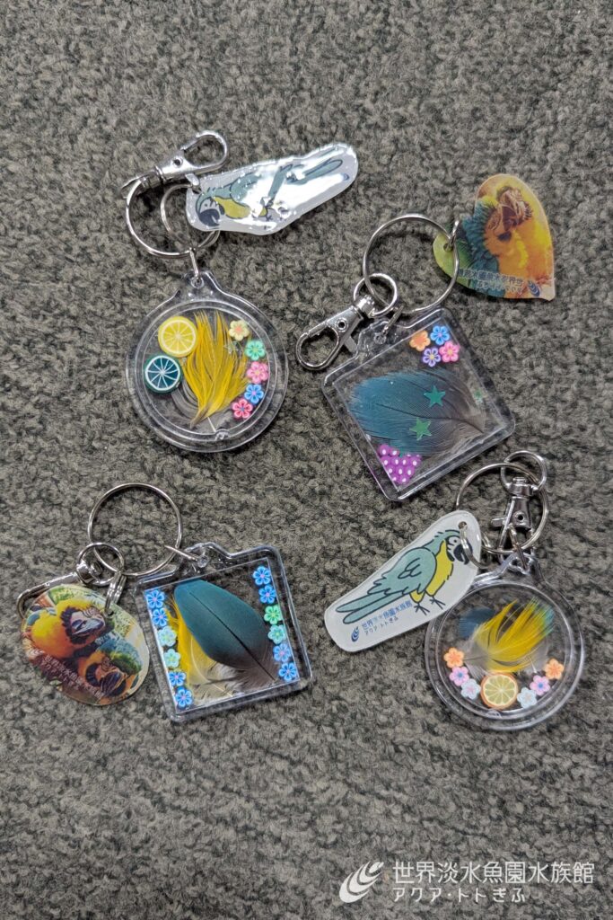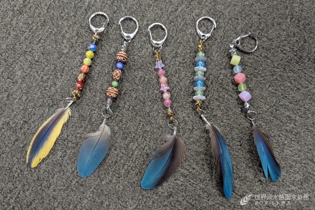 2つ目は、換羽で自然に抜け落ちた羽根を使ってキーホルダーをつくるワークショップを実施しました。