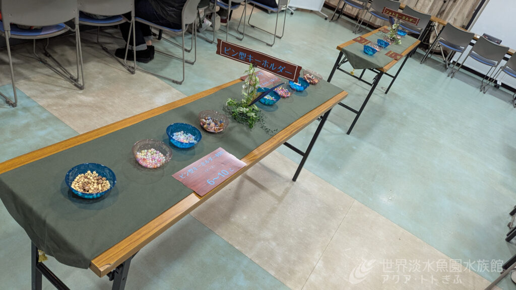 ピン型キーホルダーは、好きなビーズを組み合わせて、自由にアレンジができるようにしました。
