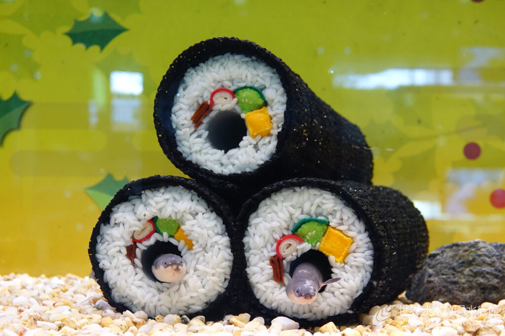 大阪出身の私としては、ぜひ岐阜でも恵方巻を広めよう!ということで実は3年前にもエントランスの水槽に恵方巻を展示しました。